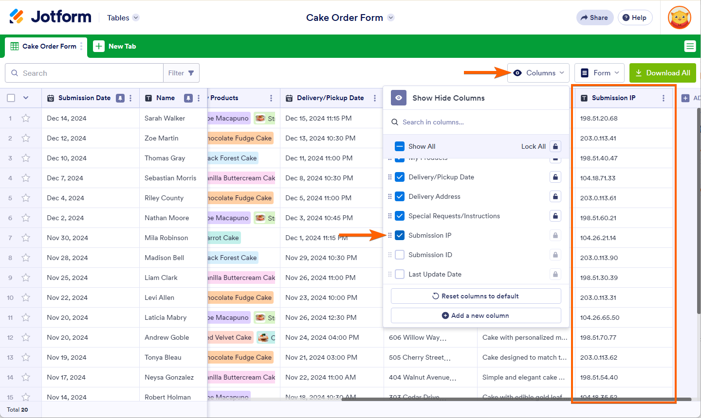 The Submission IP is a built-in column in Jotform Tables but is hidden by default. To include it in your table, follow these steps: