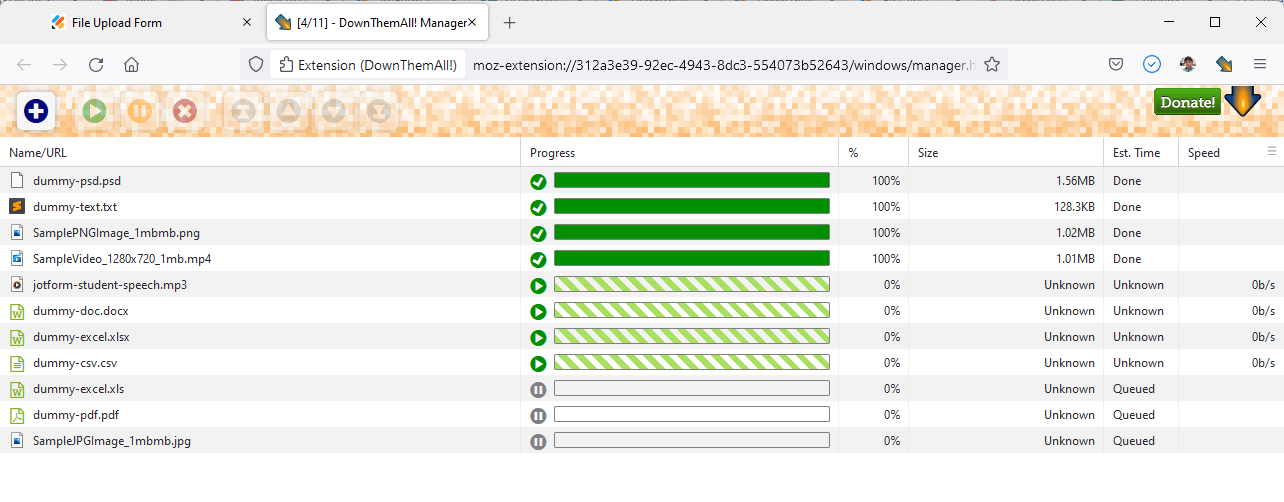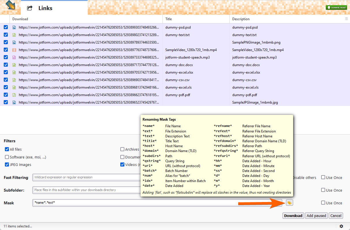 This method is an alternative to downloading your file uploads outside of Jotform Tables. You can also use this method if you prefer to filter downloads based on the file extension, or if you want to use the other features DownThemAll offers, such automatically renaming files.