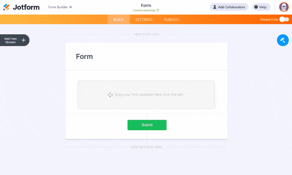 Jotform is the easiest drag-and-drop (WYSIWYG) form builder available. Simply drag and drop the form fields where you need them and any changes will automatically be saved on your form. That’s it. You don’t need to write even a single line of code. Let’s dive in!
