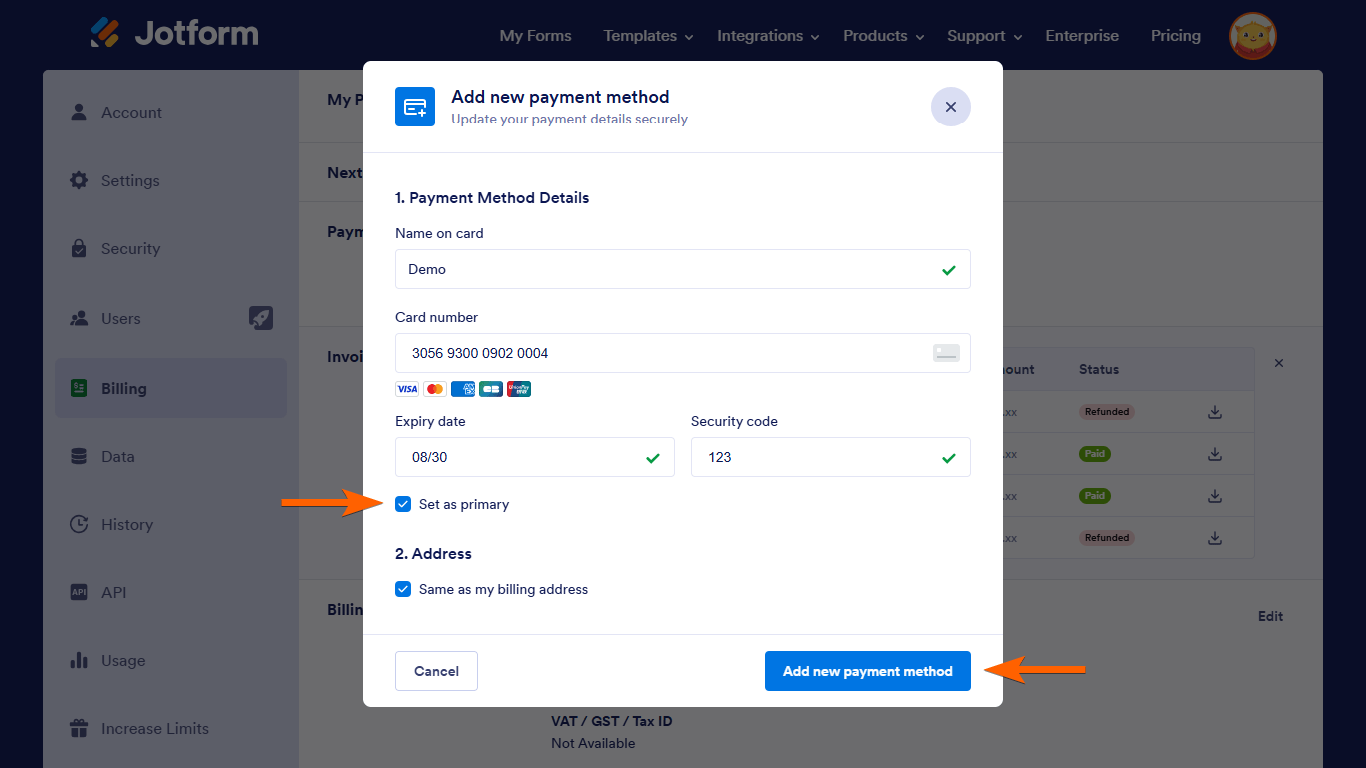 For payments processed through FastSpring, you will be redirected to your FastSpring subscription when managing your payment method from the Billing page. With FastSpring, you can use credit/debit cards, Google Pay, or pay with Amazon for your Jotform subscription.