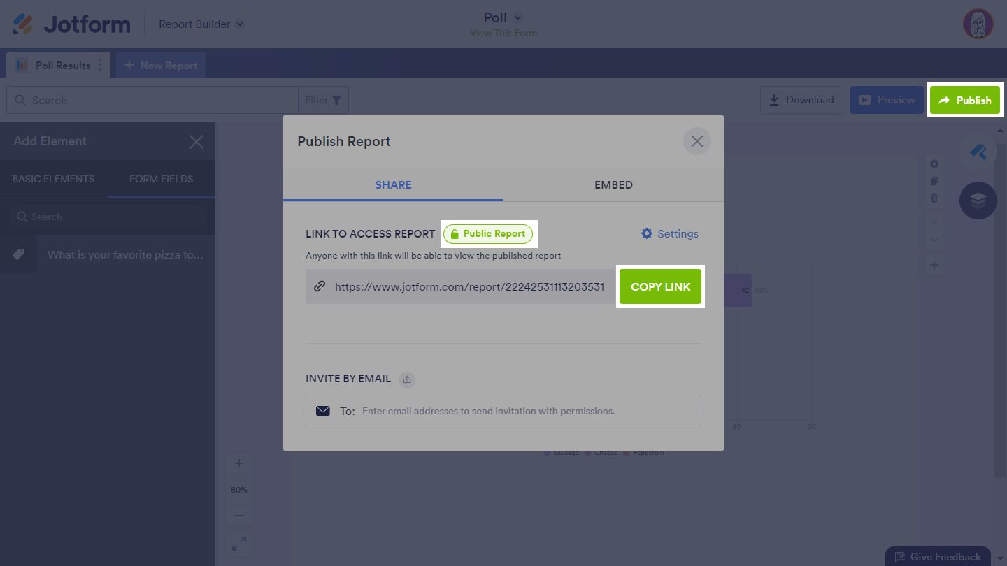 - Set your report to Public, then copy the provided link. See How to Share Your Visual Report to learn more.