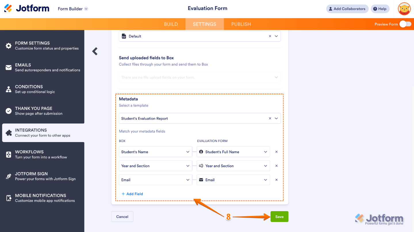 - Now, scroll down to the Metadata section and then Select a Template. Start mapping your form fields and click on Add Field if you want to map more. Once you’re done, click on Save.