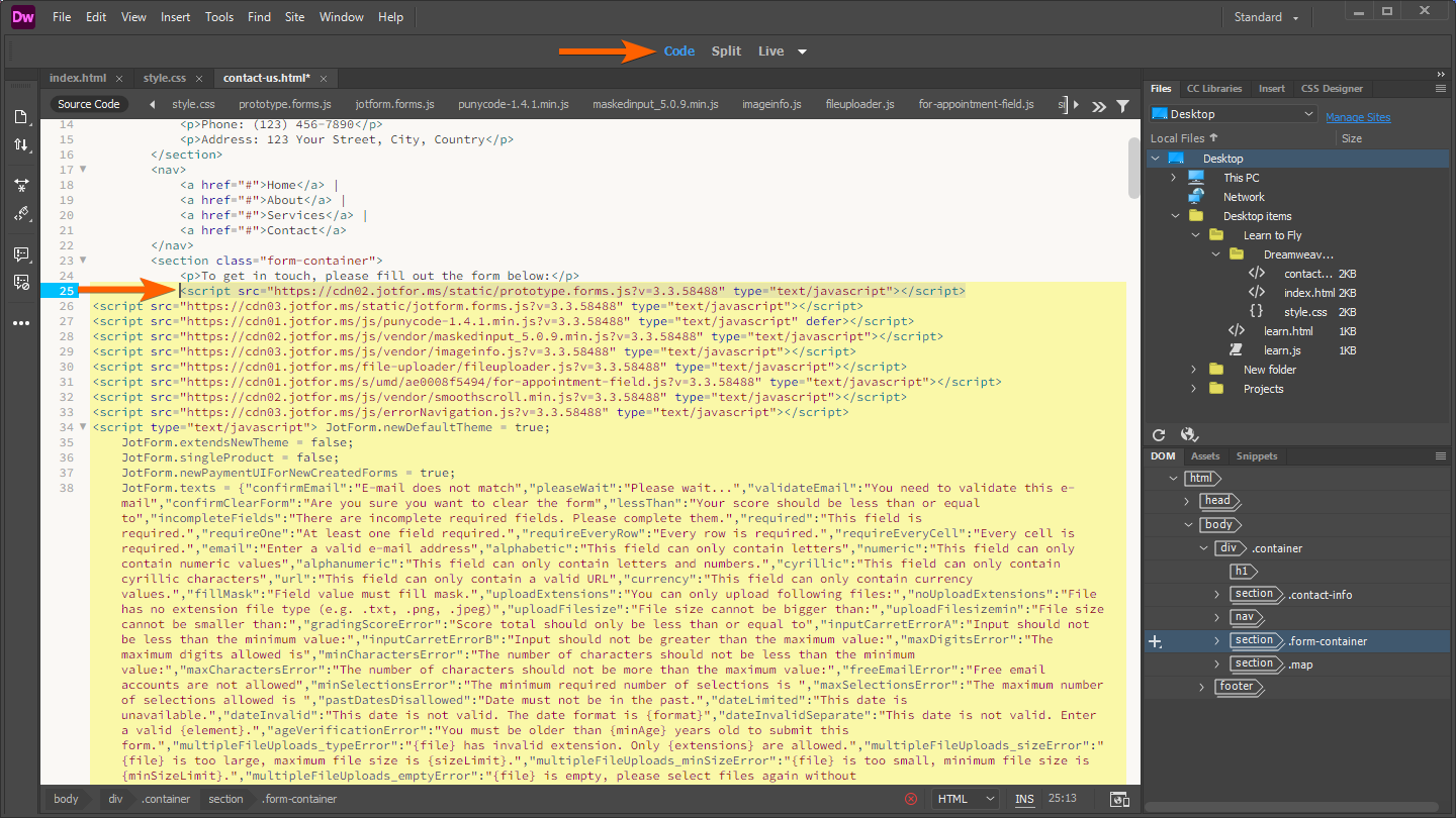 Follow these steps to copy the form embed code for your website created in Dreamweaver:
