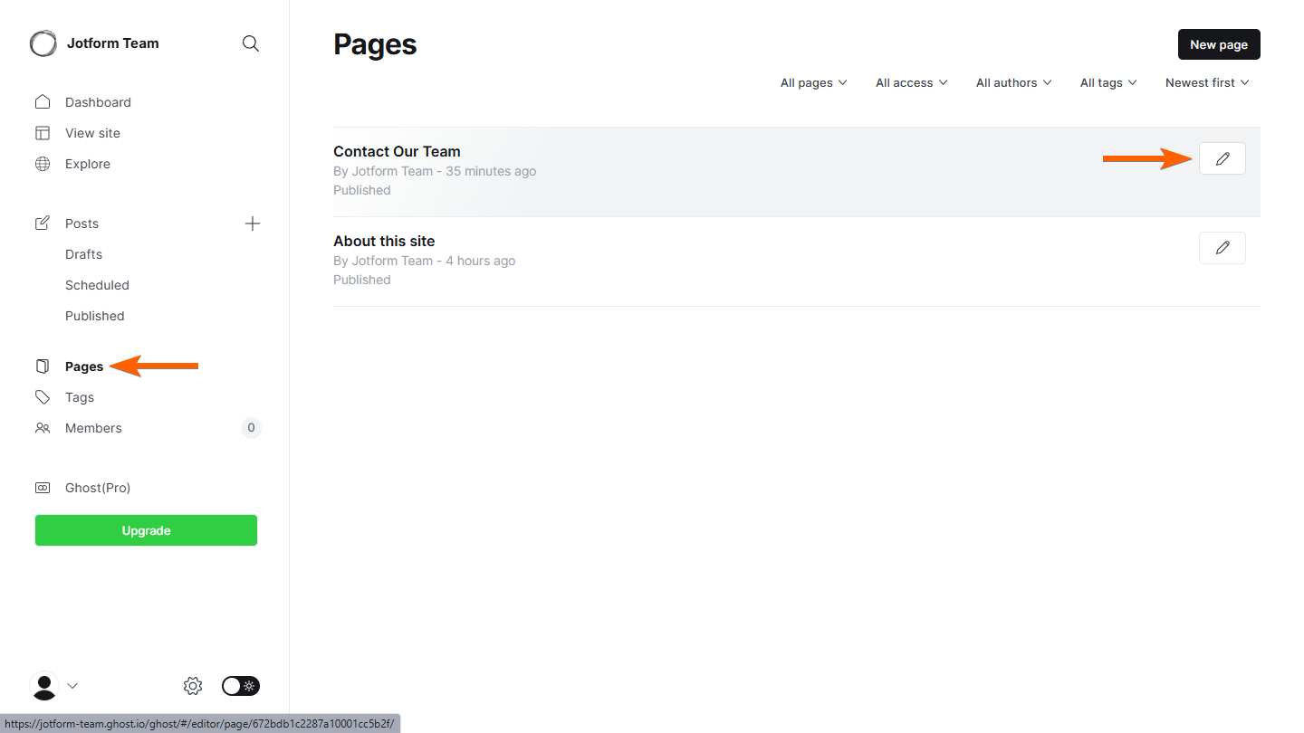 Once you are signed in to your Ghost site address, follow these steps to embed your form on your Ghost website: