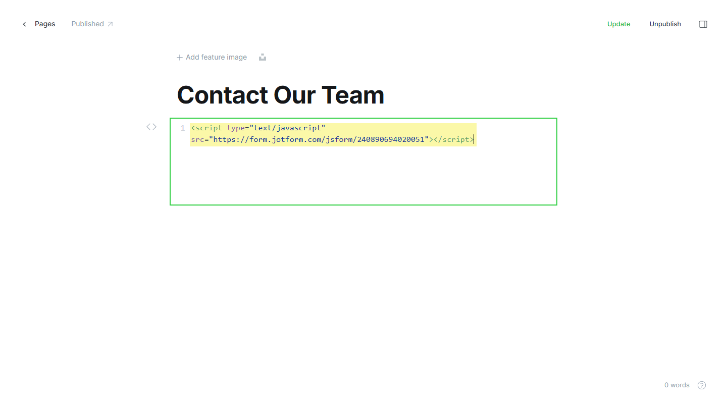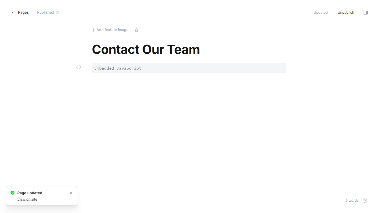 The Ghost Editor saves any changes automatically as draft. After you paste your form embed code and update your website, the HTML card will show an Embedded Javascript message in the Ghost editor.