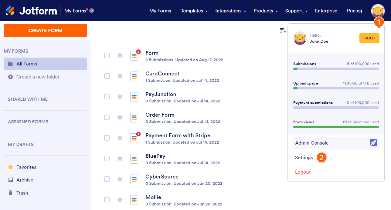 - All Actions — View a complete log of all activities performed in your Jotform account.