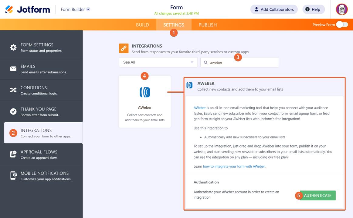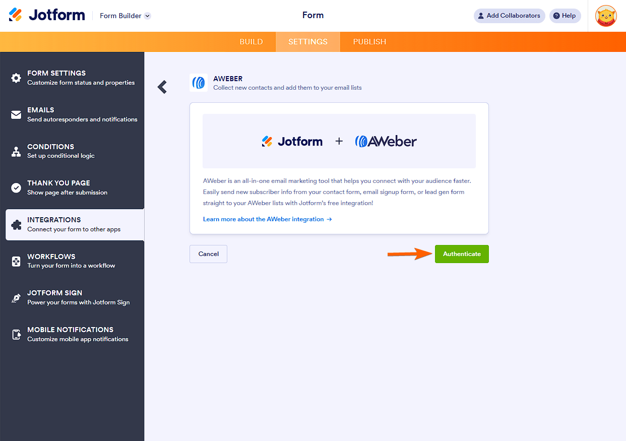 If you want to automatically pass your subscribers collected from Jotform to your AWeber’s email lists, follow these steps: