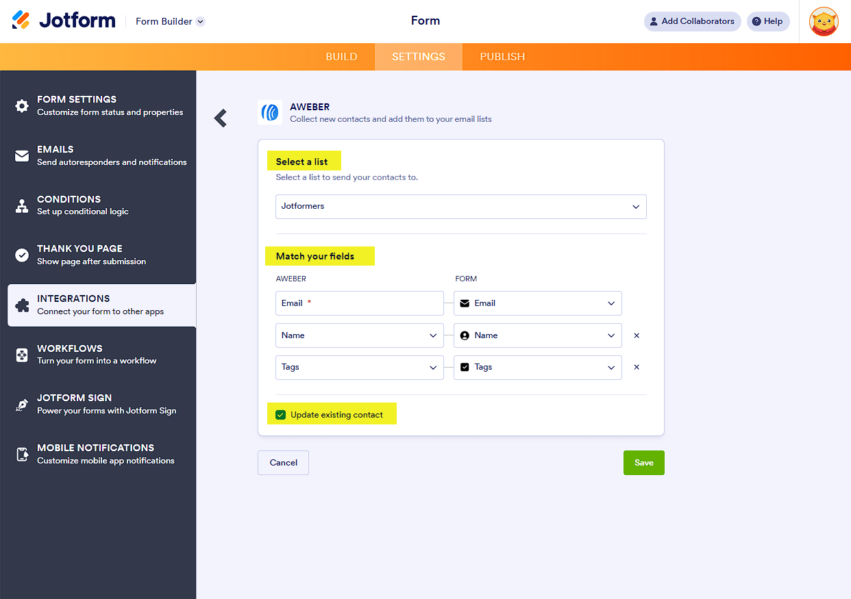 - Match your fields — Match the fields between AWeber and Jotform.