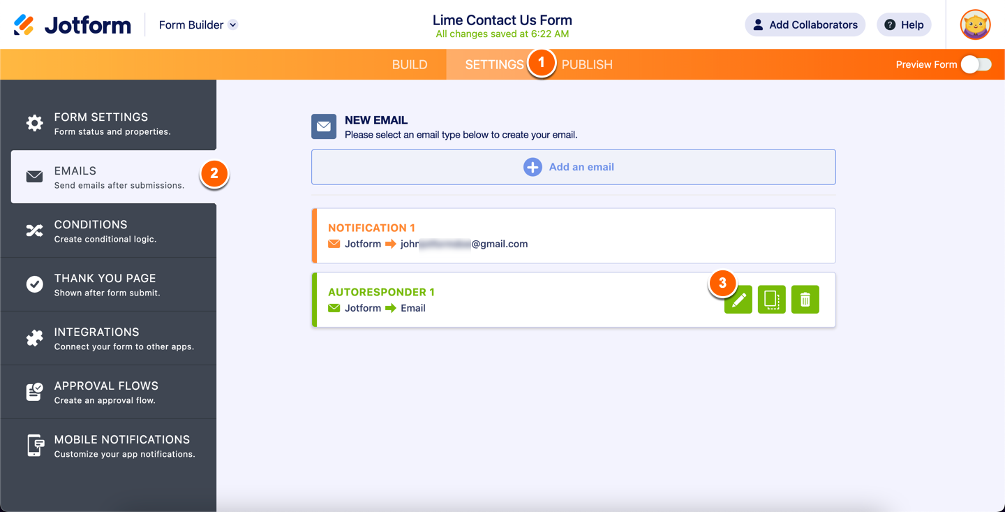 - In Form Builder, in the orange navigation bar at the top of the page, click on Settings.