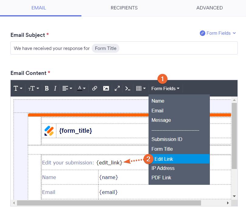 I need submitters to be able to edit their form after they have completed it. The above instructions are very clear but my email settings does not have the 'edit link' option in the form fields section. It only shows 'Submission ID, Form Title and ID Adress' at the very end past all the form questions.