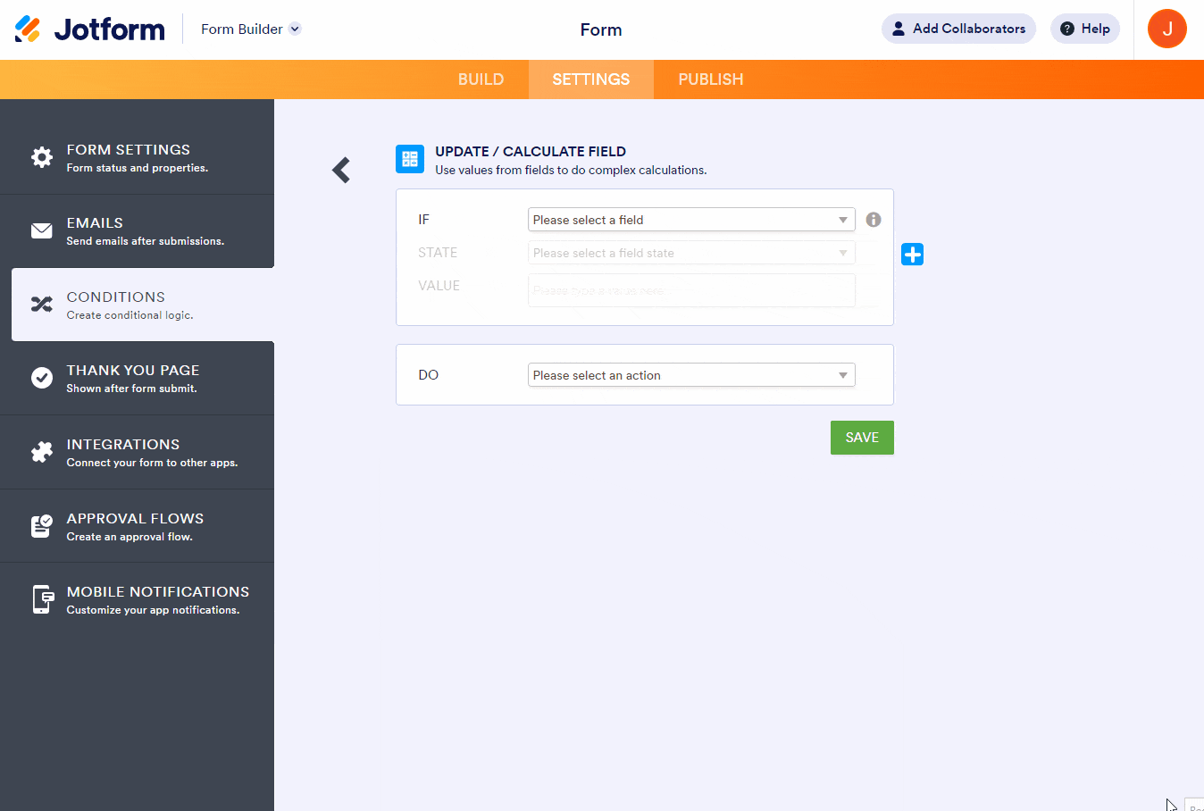 Form Calculation is one of the advanced features of Jotform. You can perform calculations using the FormCalculation Widget or the Update/Calculate Field condition.