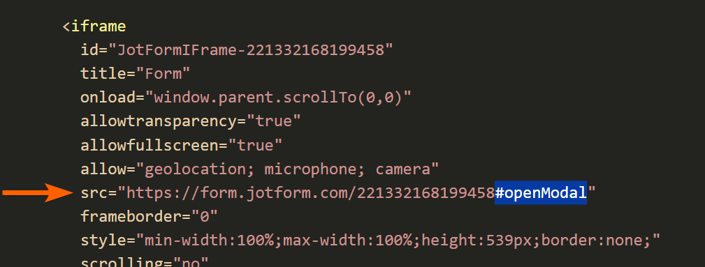 For embedded forms, append #openModal to the iframe’s SRC attribute to automatically open the modal window when the page loads.