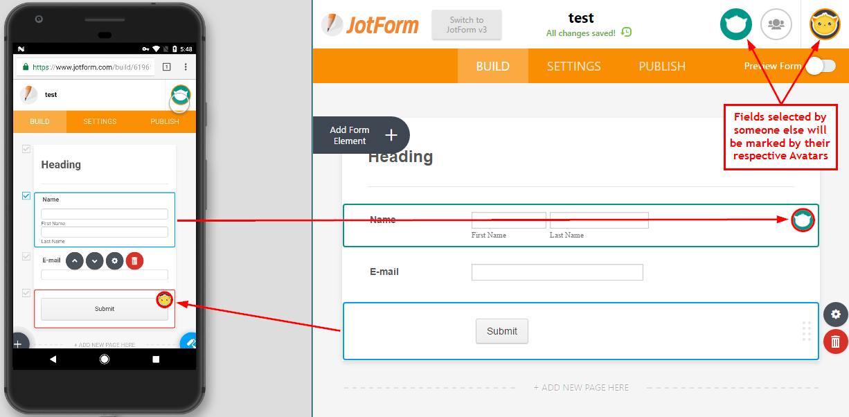 The collaborator’s avatar will appear on the element they’re working on, highlighted in a randomly assigned color, so everyone can see who is working on which element in the Form Builder.