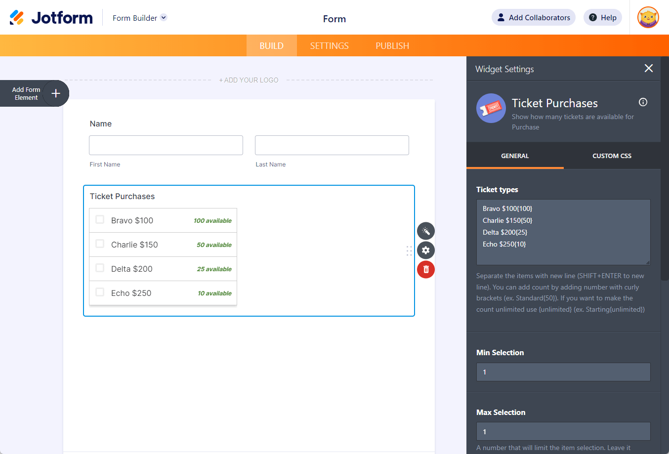 - Ticket types – like the Inventory Widget, ensure you will name your products, show the prices, and don’t forget to assign the number of stocks left per product.