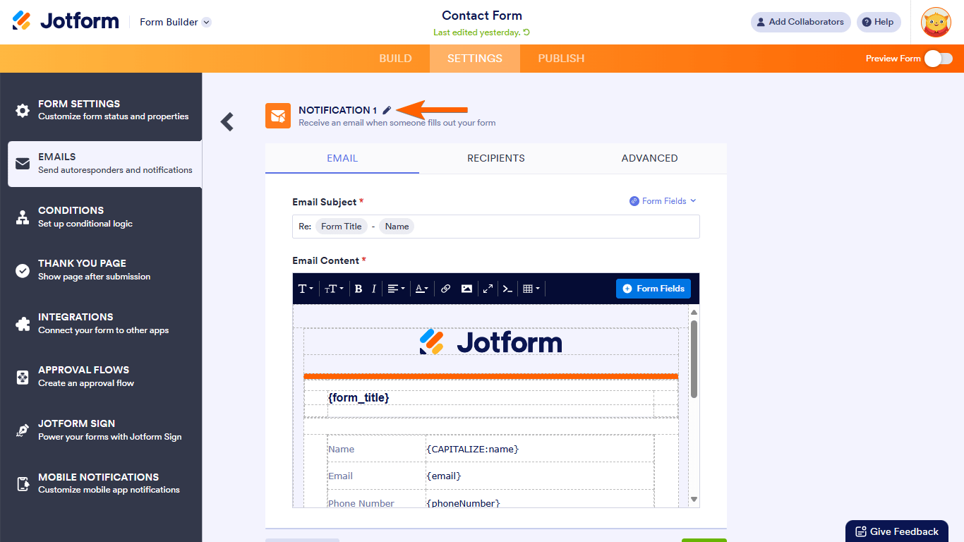 You can rename the email templates saved on your form to identify their purpose or function easily. While in the email settings click on the Pencil icon next to the email template name to start editing it.