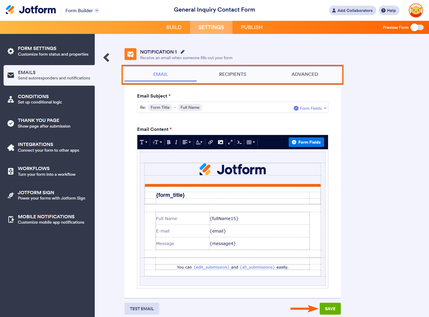 - Update each setting under the Email, Recipients, and Advanced tabs to match your preferences. See Explanation of Email Notification and Autoresponder Settings for more details.