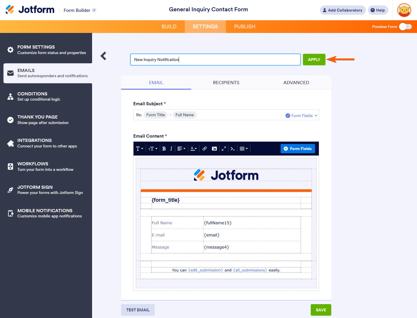 Enter a new name for your email template then click on the Apply button on the right. Don’t forget to click on the Save button at the bottom of the email settings to apply your changes.