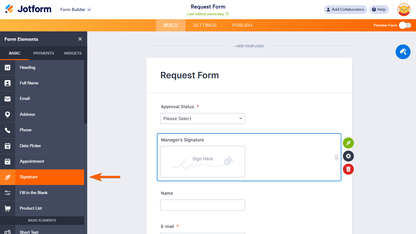 - Add a Signature element to your form if your approval process requires an e-signature from your approvers. You can also use any of the signature widgets.