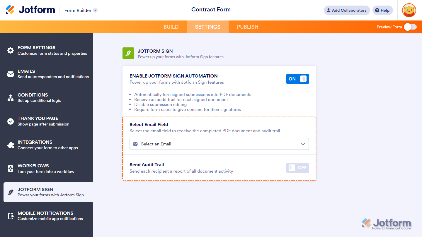 After enabling Jotform Sign, you can also configure the other Jotform Sign settings as needed: