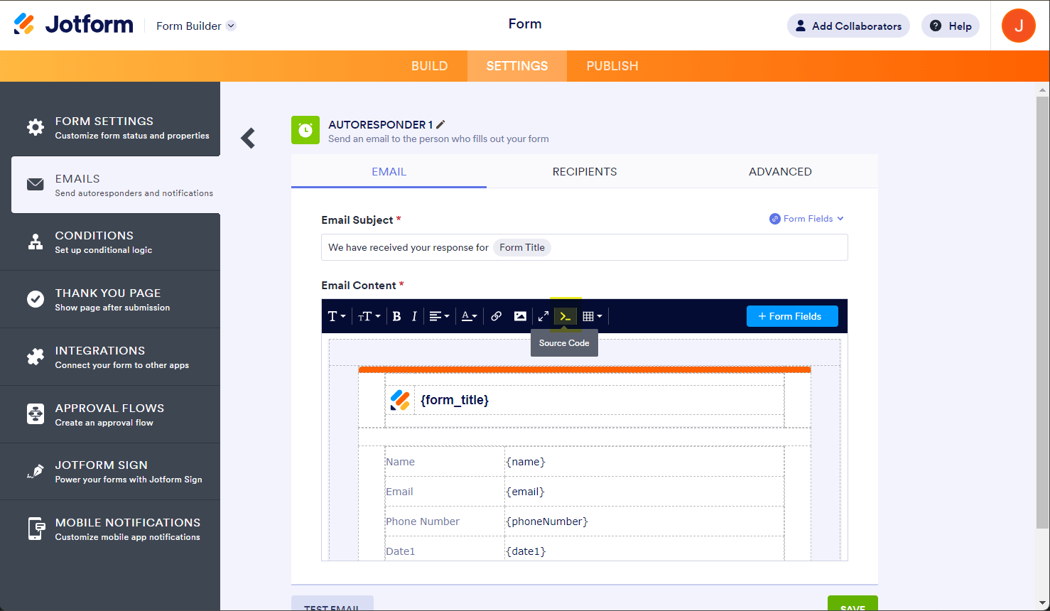 - In the Form Builder, go to the Settings tab.