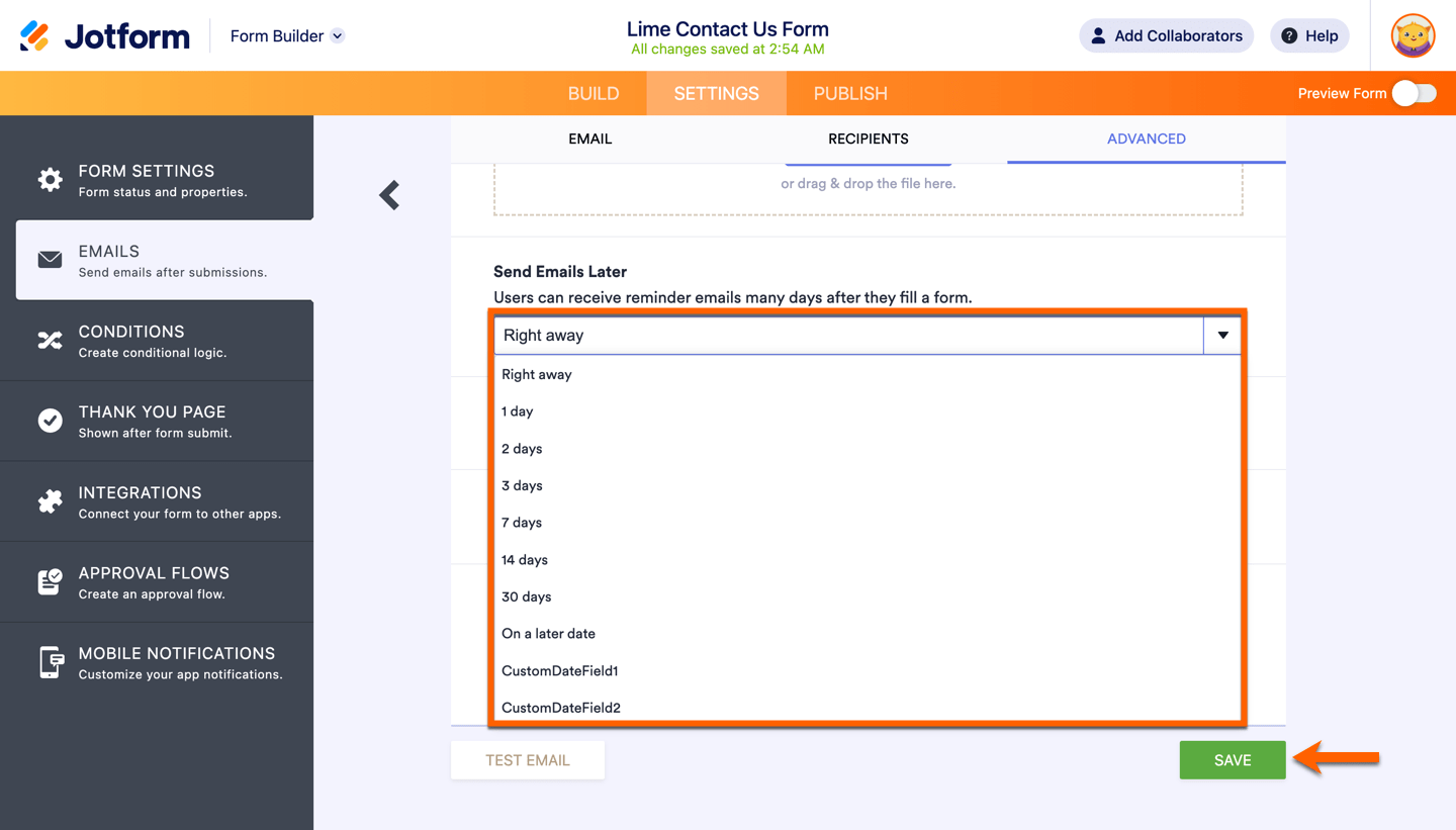 - Right away — The email will be sent right after submission.