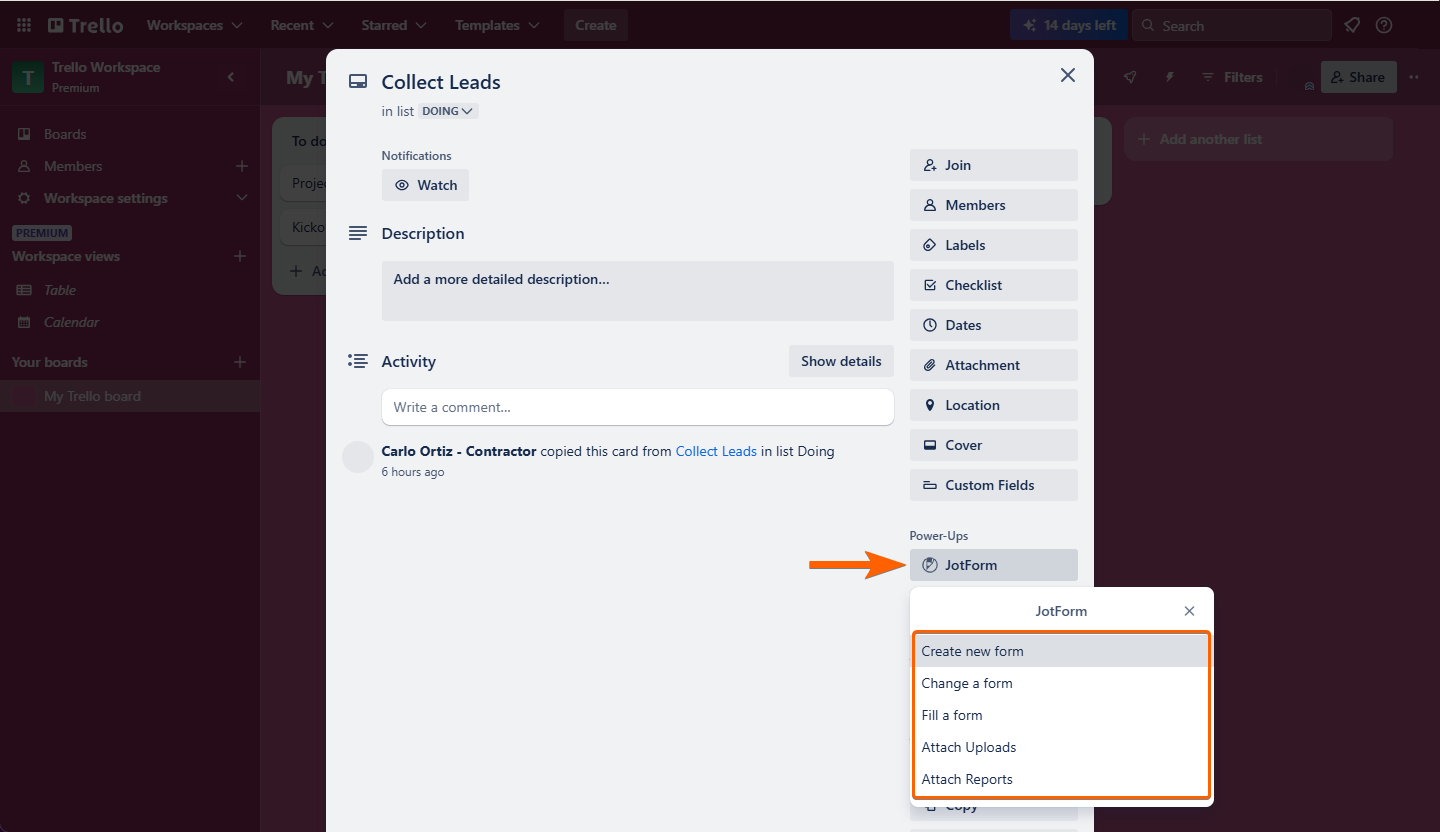 - In your Trello Board, click on any card where you want to use your Jotform forms.