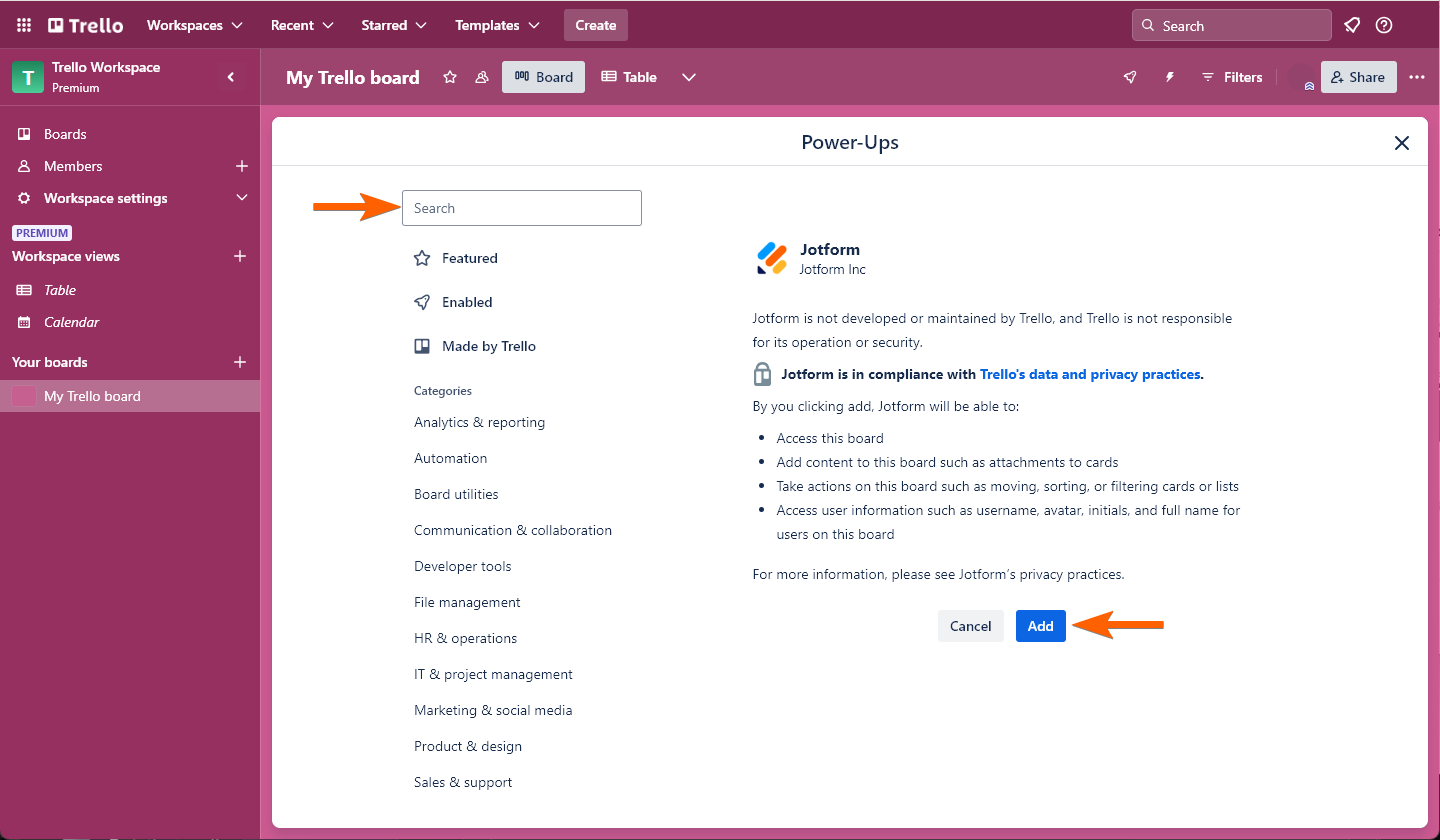 - In the Trello Dashboard, type Jotform in the search bar and click Add to integrate it with your board.