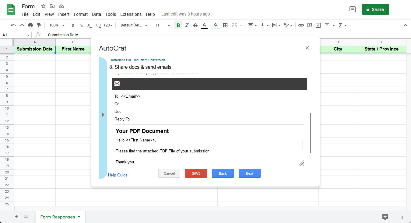 After setting up the base Google Doc template, you should now be able to set up Autocrat to create the PDF document and send it via email. Here are the steps: