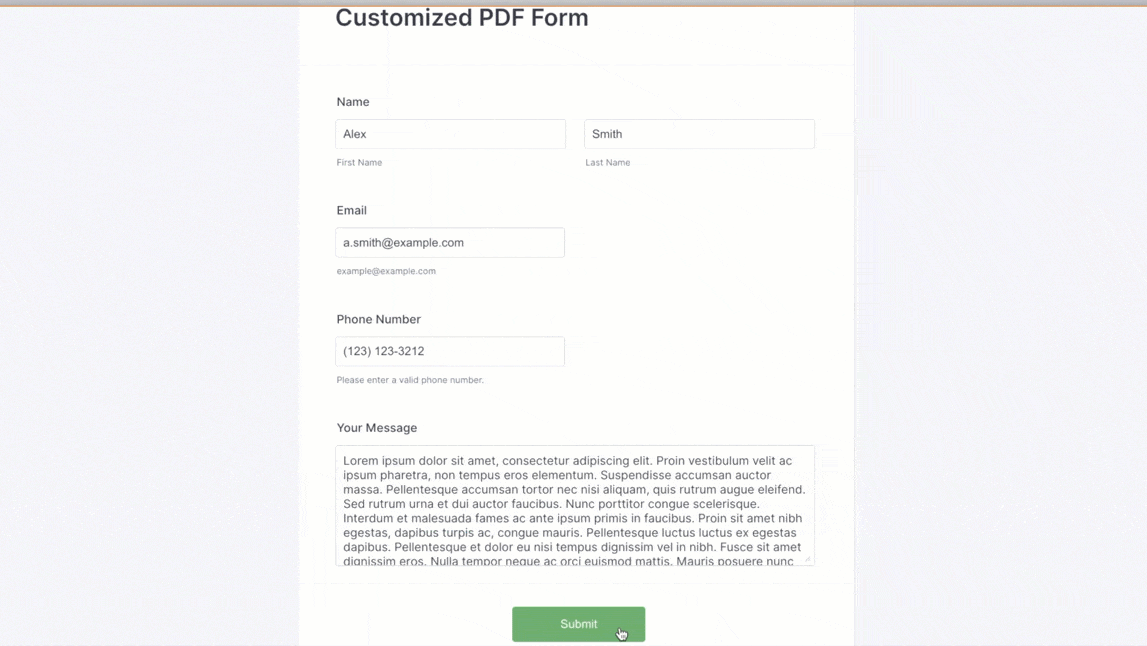 Here’s a test form that we made for you: https://www.jotform.com/72362058406959. Please feel free to test it out with your active email address. Once submitted, you should receive the PDF document attached to the email.