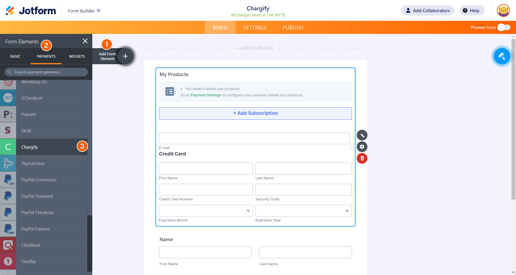 Create a new or edit an existing form and follow the steps below to integrate Chargify.