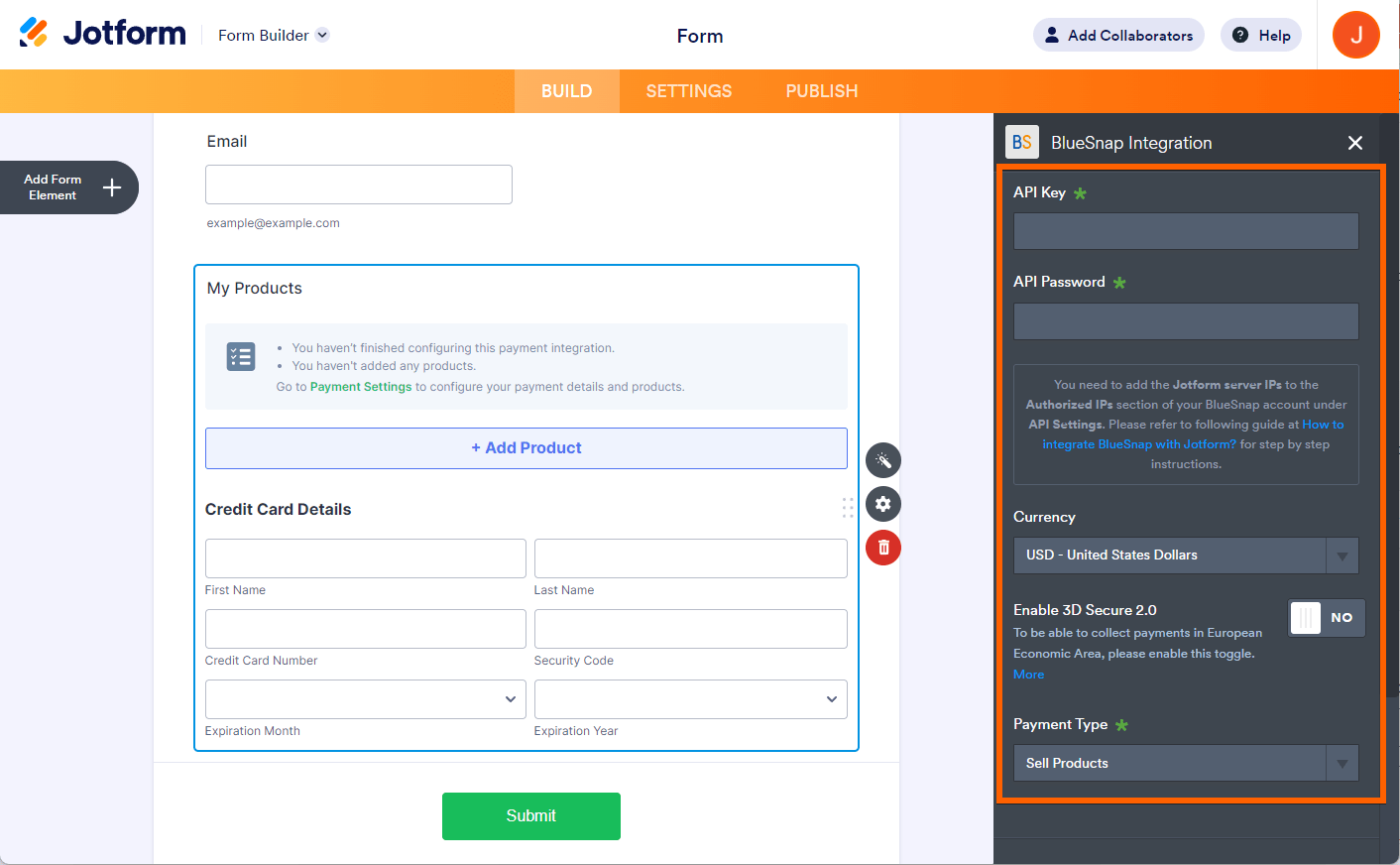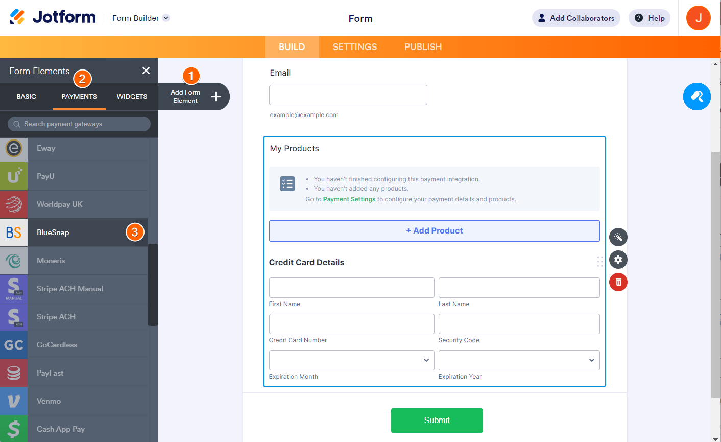 Create a new or edit your existing form and follow the steps below to integrate BlueSnap into your form.