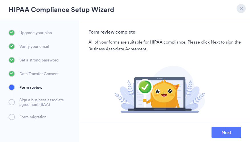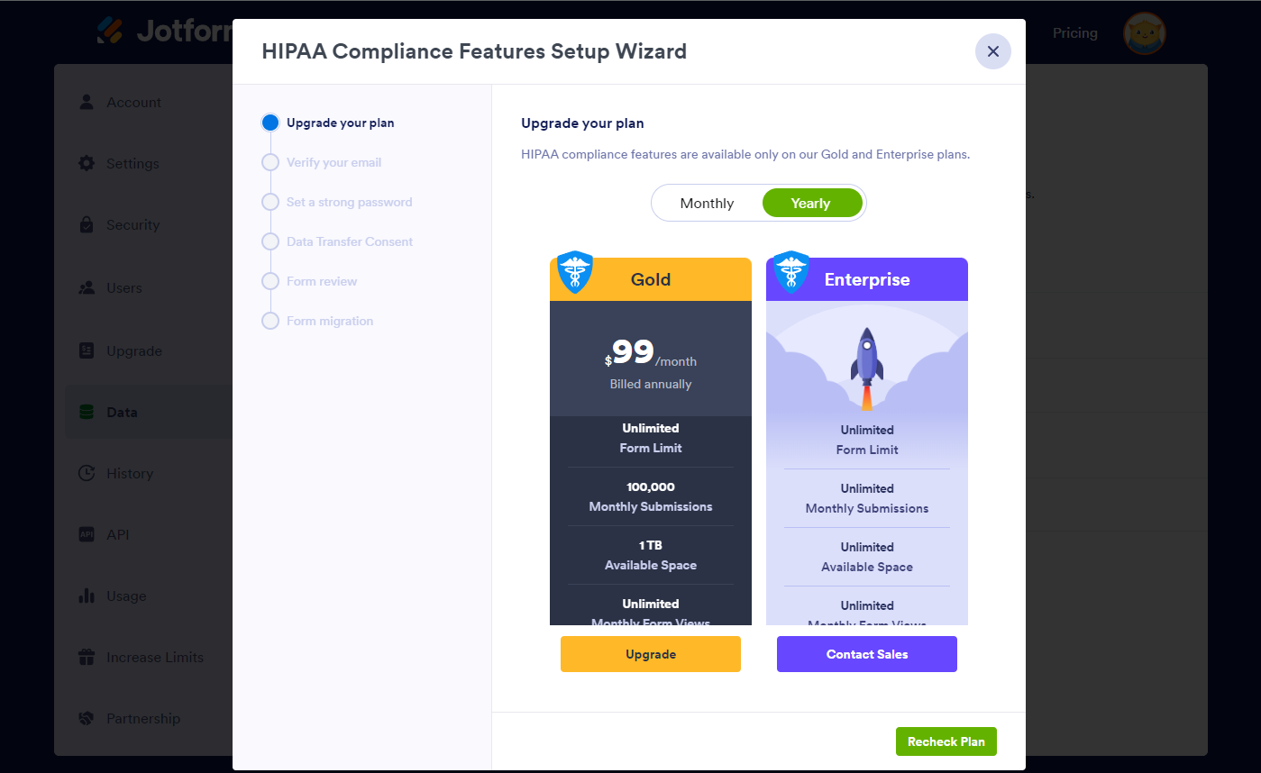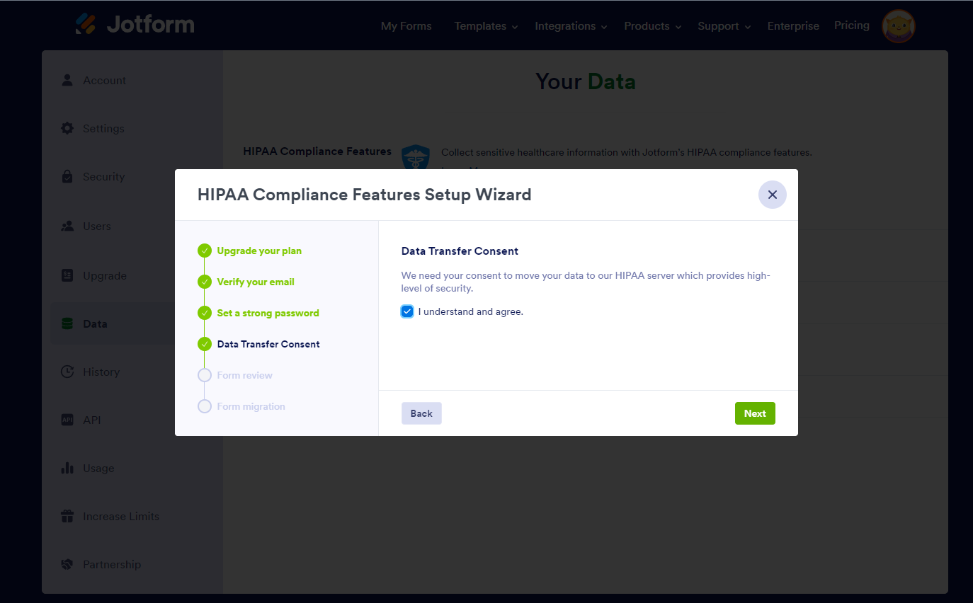 You may create a new account or enable HIPAA compliance features from your existing Jotform account. The HIPAA upgrade wizard will help you navigate through the end.