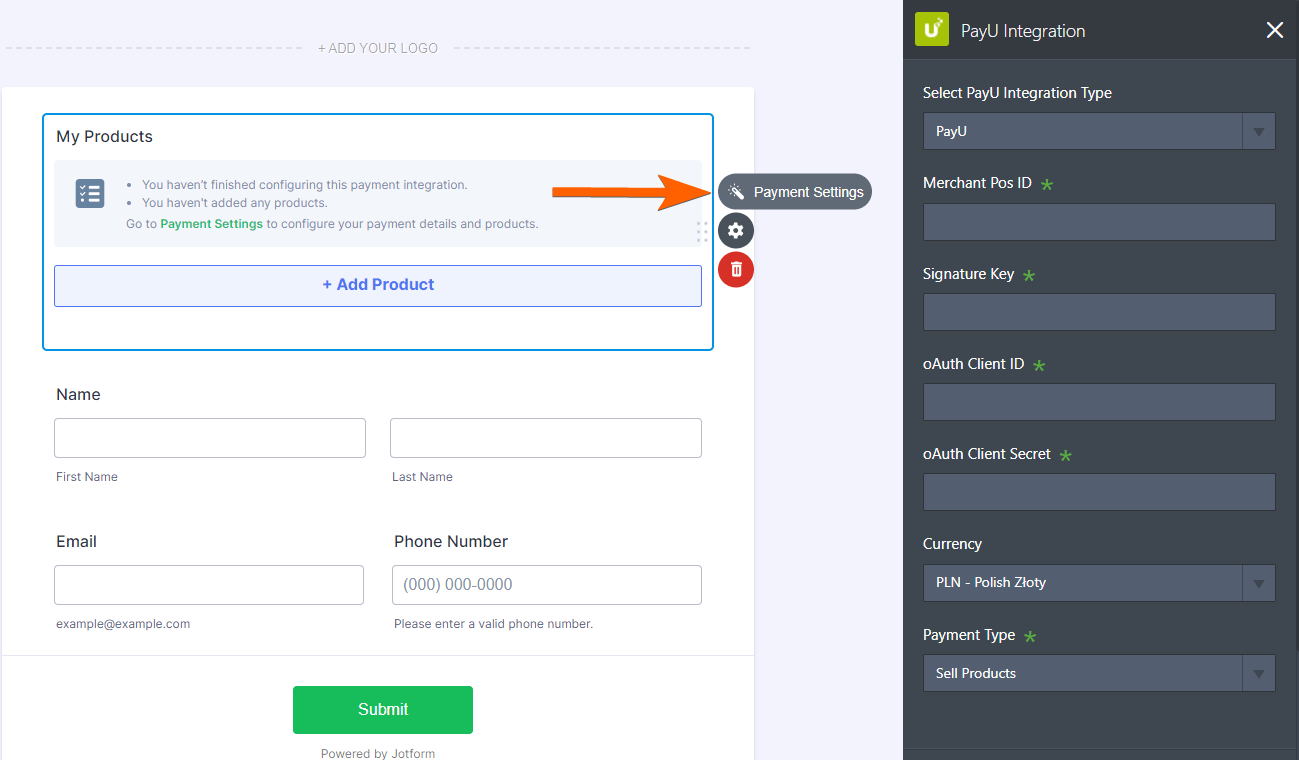 To connect PayU with Jotform, you’ll need a few credentials from your PayU account settings. If you’re not sure where to find them, just reach out to PayU Support, and they’ll help you get what you need.