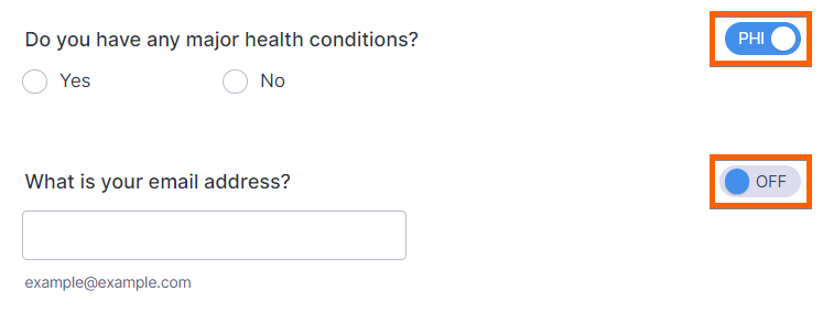 - PHI (protected) — For fields collecting sensitive healthcare data that can’t be used in insecure mediums.