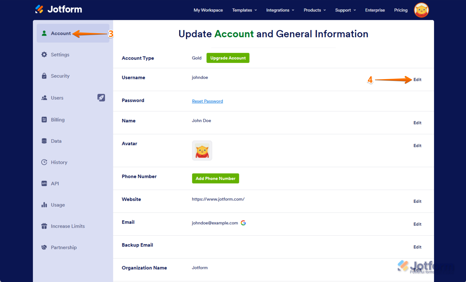 When registering for a Jotform Account, you only need to provide your email address. Jotform will automatically create a username for you. But don’t worry, it’s easy to change it to something different.