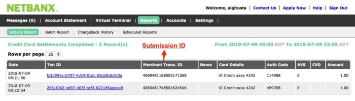 You can also see the Submission ID for the related payment in Paysafe’s interface under the Merchant Trans. ID column.