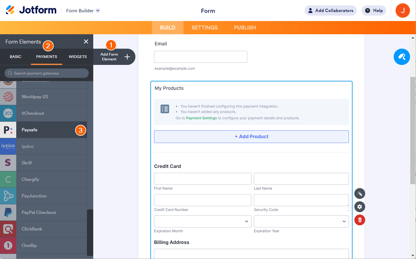 Create a new or edit an existing form and follow the steps below to integrate Paysafe.