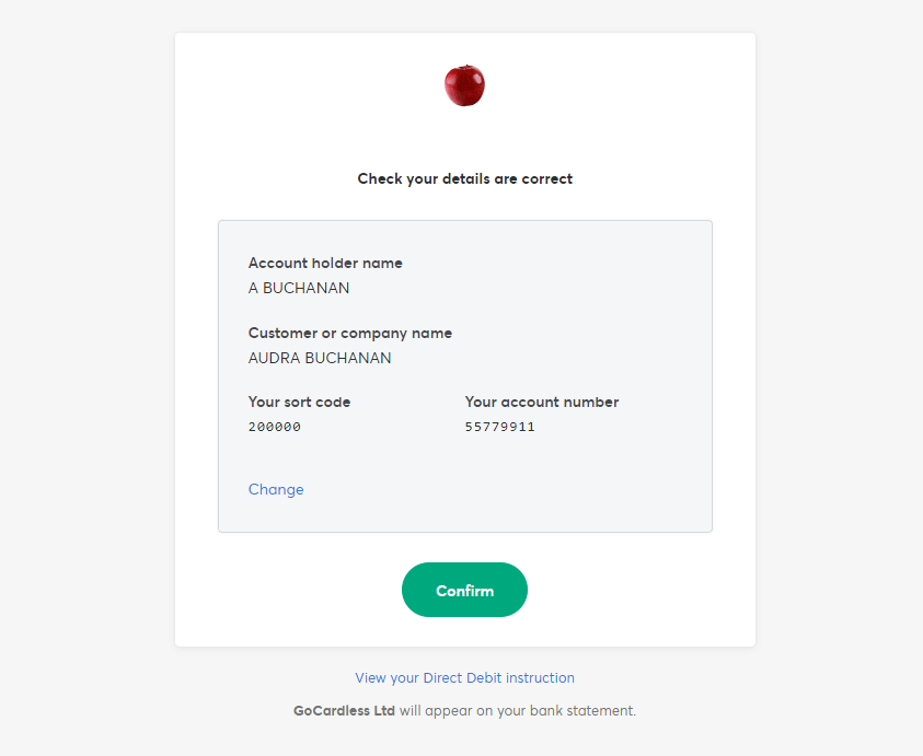 Clicking the Set up a Direct Debit button from the Mandate Creation page will redirect your users to the confirmation page.