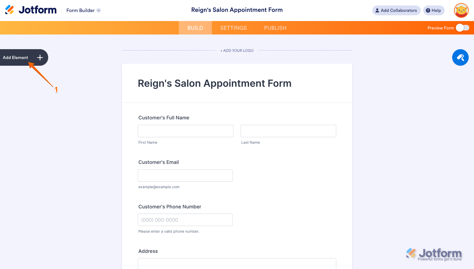 - In Form Builder, click on the Add Element menu on the left side of the page.