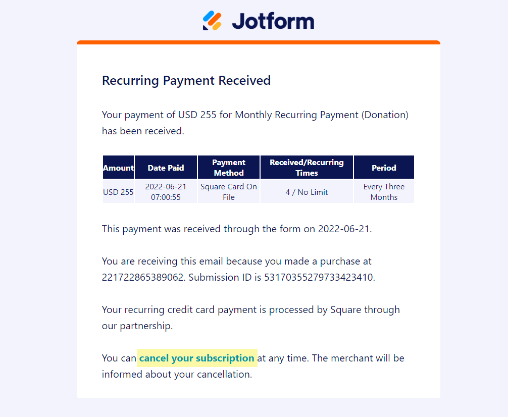 I am testing this out and when I submit a payment for a subscription through Jotform, connected to Square, I get an email receipt/confirmation from Jotform, but not from Square like the one you show which gives the option to cancel the subscription at any time.