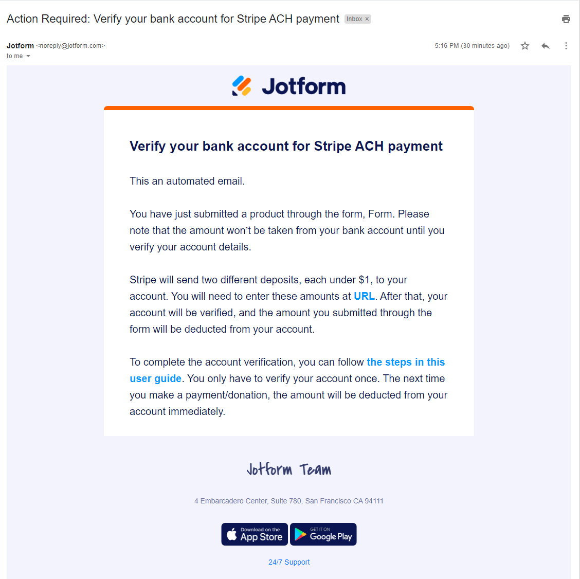As part of the verification process, Jotform sends the following email to the customer containing the verification instructions and the link to verify the bank.