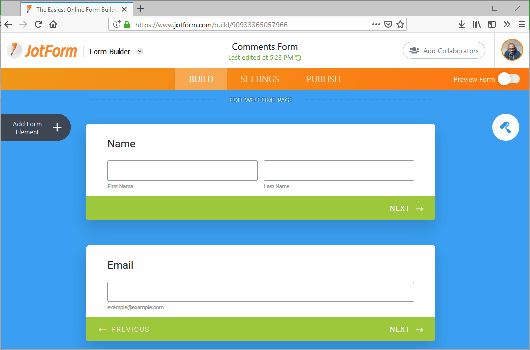 - In Form Builder, in the orange navigation bar at the top of the page, click on Settings.