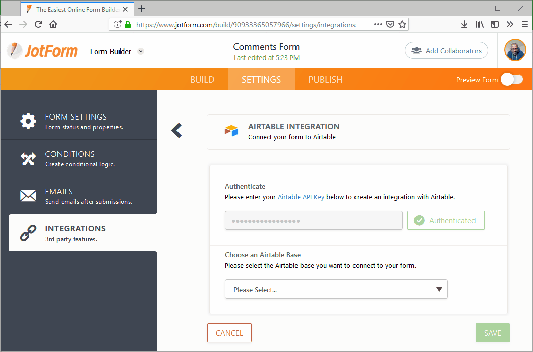 - Jotform remembers the access permissions for the Bases you’ve selected most recently. So when you re-authenticate with Airtable, make sure to add or select the same Bases in the integration to keep everything running smoothly.