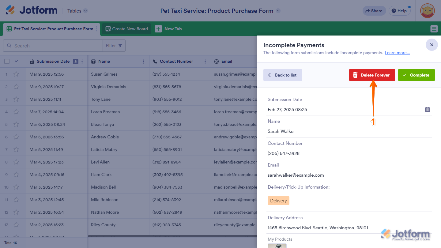 - While viewing the details of the submission in the Incomplete Payments section of Jotform Tables, click on Delete Forever at the top.