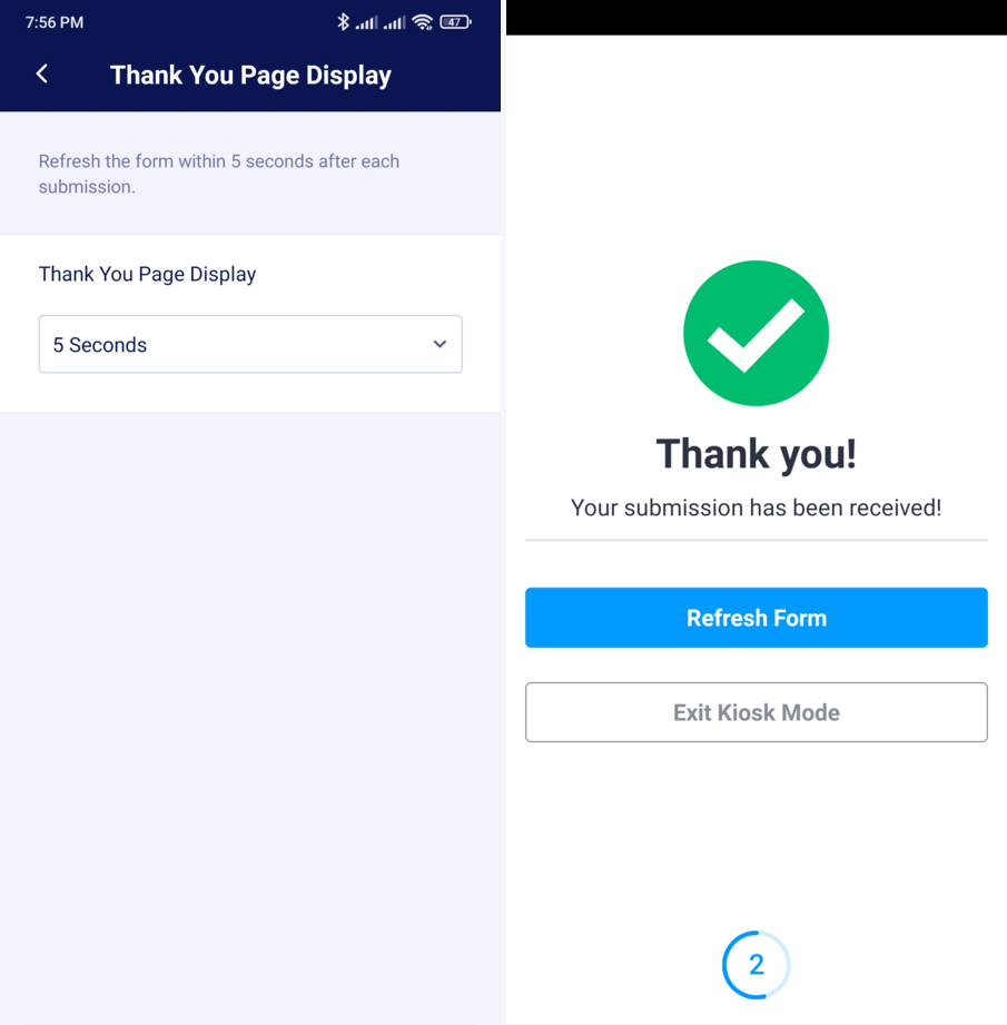 The Thank You Page Display is enabled by default in Kiosk Mode and cannot be disabled. The default display time is 5 seconds, but you can adjust it to a minimum of 2 seconds and a maximum of 5 minutes. The timer is visible at the bottom of the “Thank You” message after each submission.