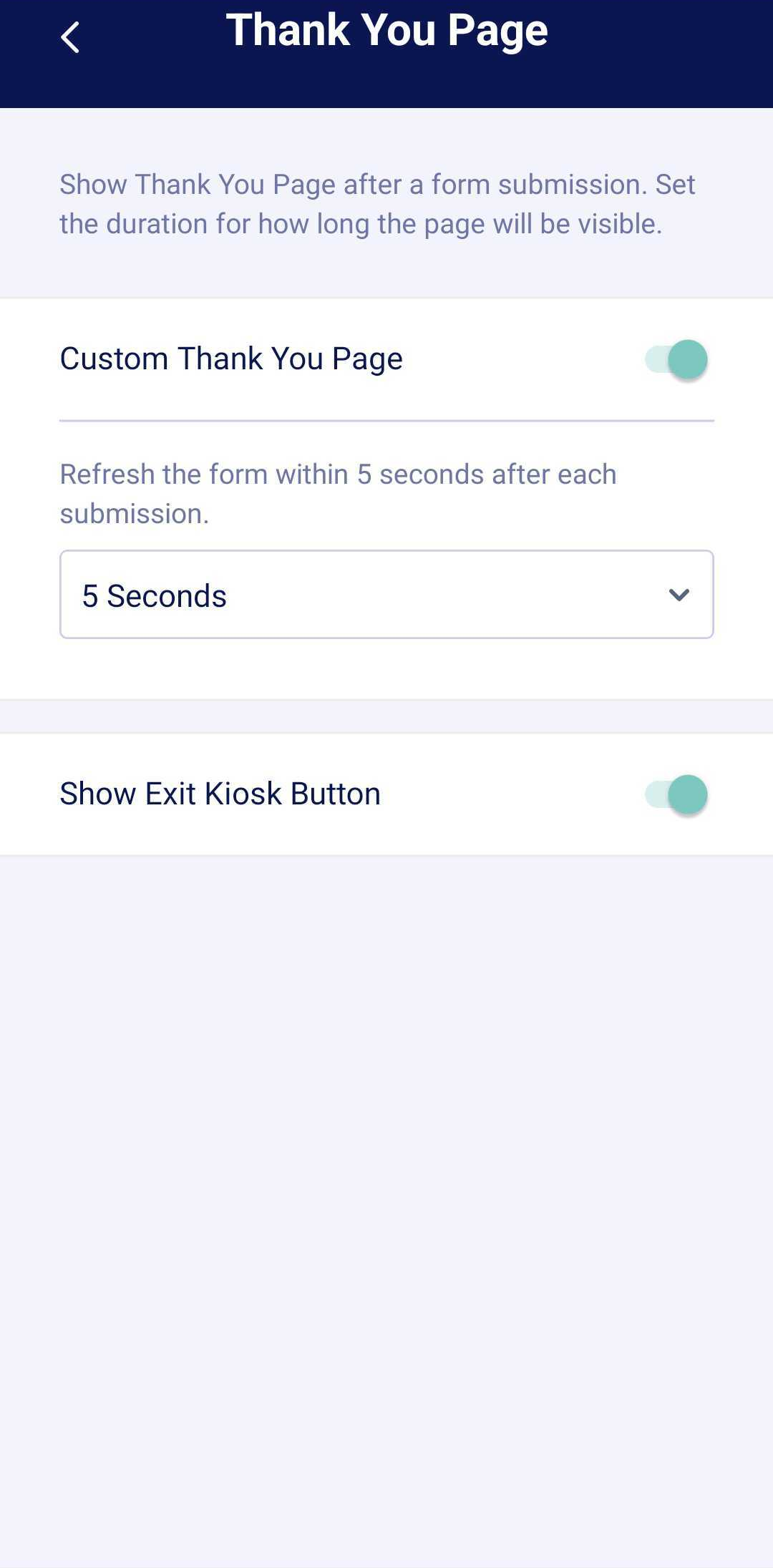 - While you’re in the Kiosk Settings screen of your form in Jotform Mobile App, tap on Thank You Page.