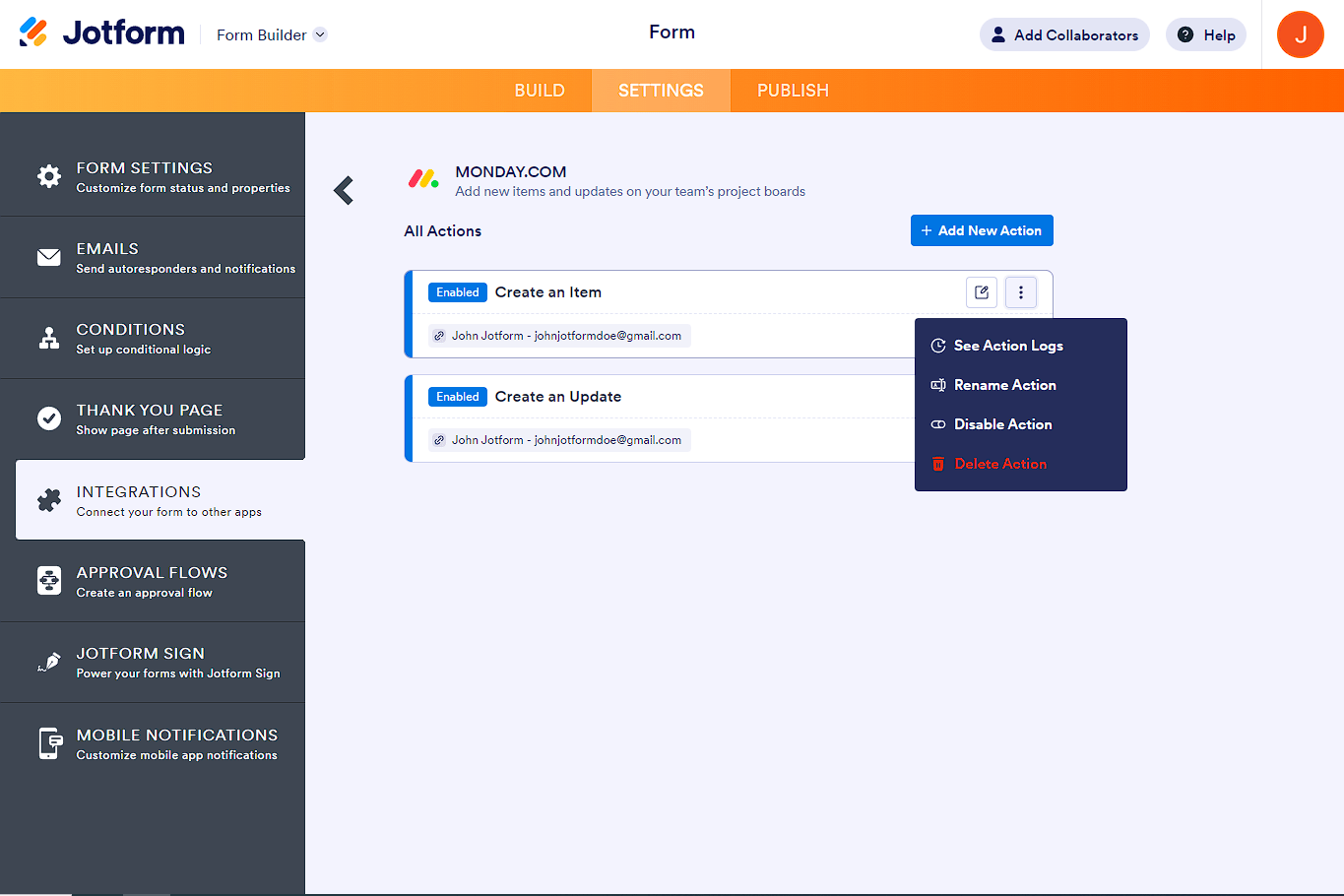 Jotform’s integration with monday.com sends information from Jotform to your monday.com account as soon as someone fills out and submits a form.