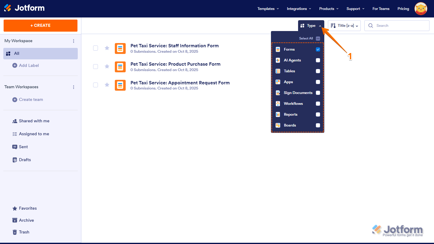 - On your My Workspace page, click on Type at the top and in the Dropdown menu that opens, uncheck the boxes next to all the assets except Forms, so only they’ll be shown on the page.