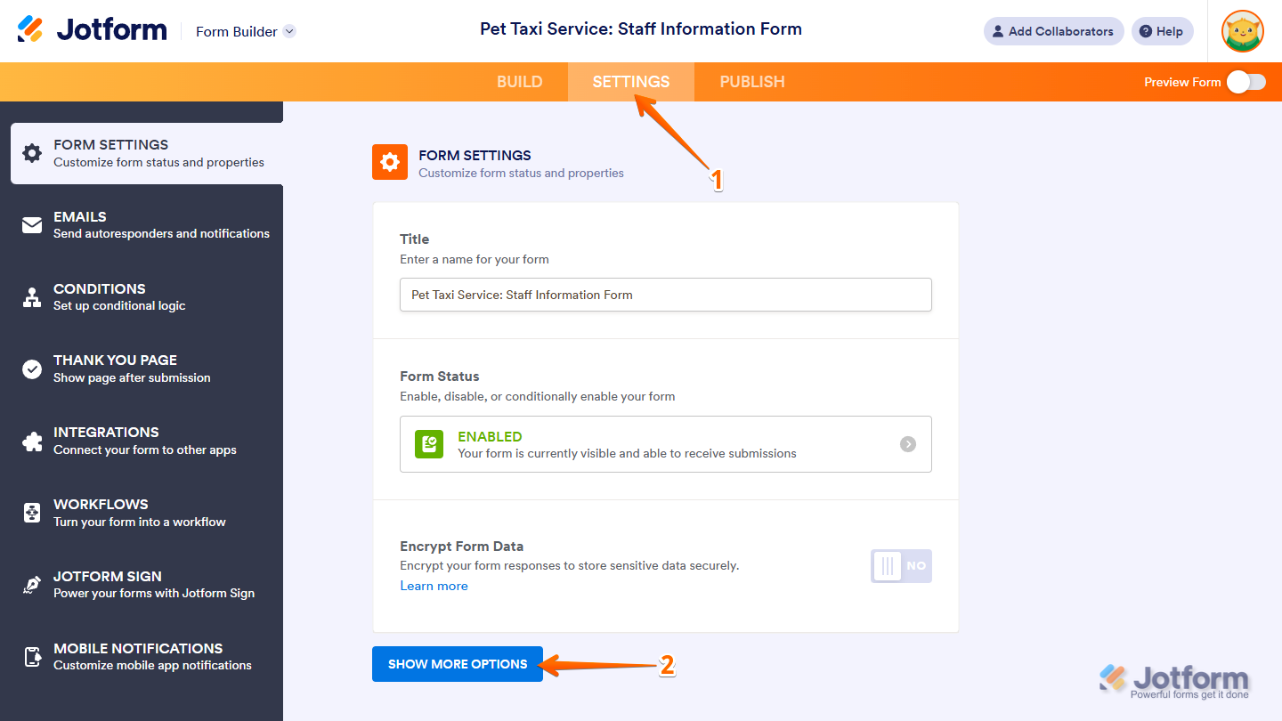 - Now, under Form Settings, click on Show More Options at the bottom.