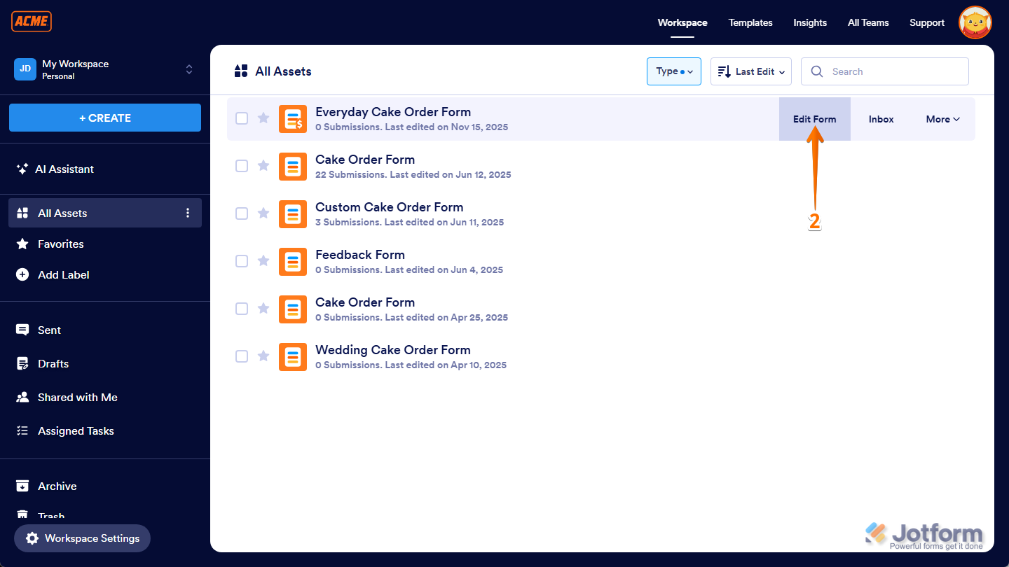 - Then, hover your mouse over the form you want to share with a collaborator, and then click on Edit Form on the right side of the page. For example, Product Order Form.